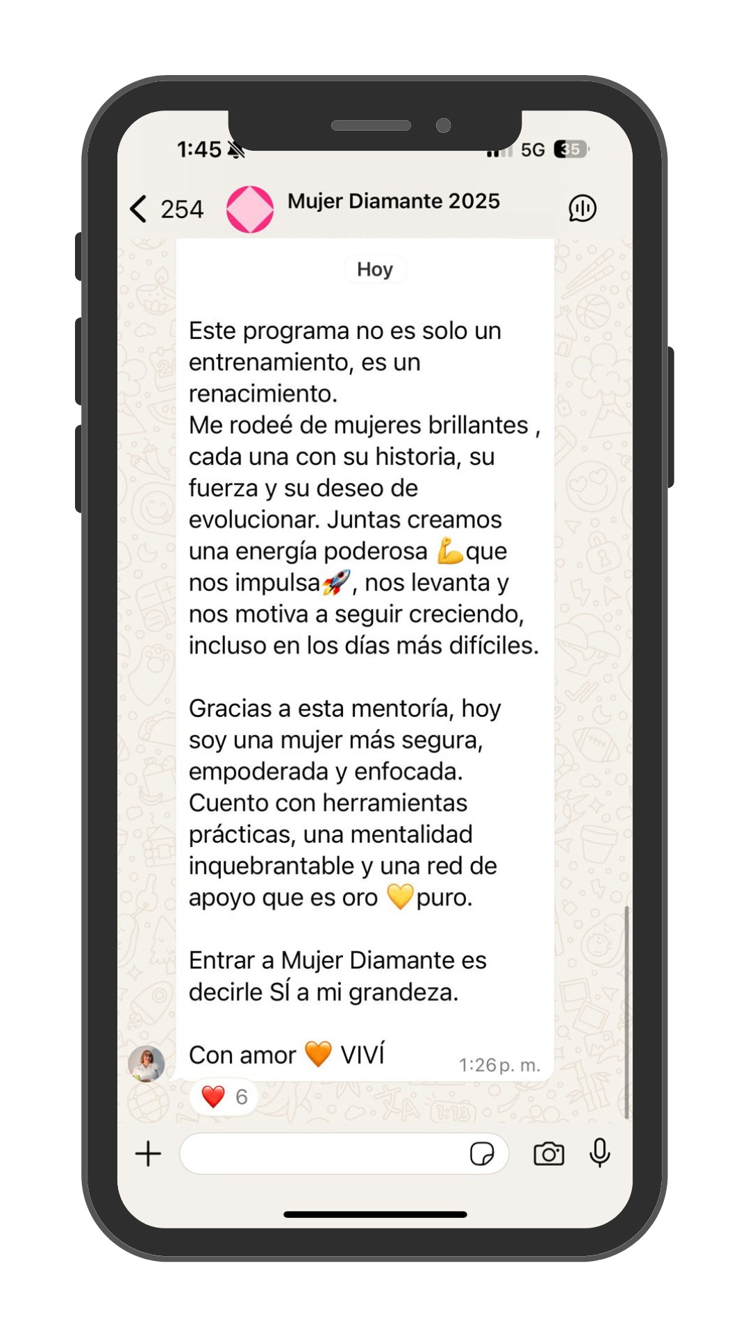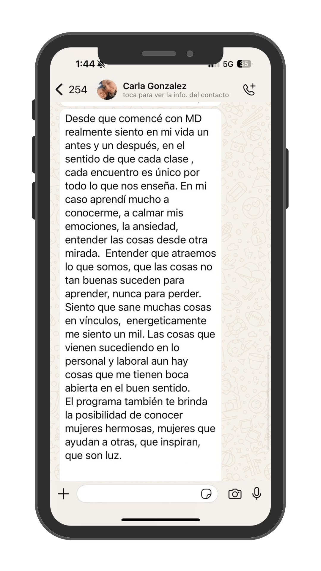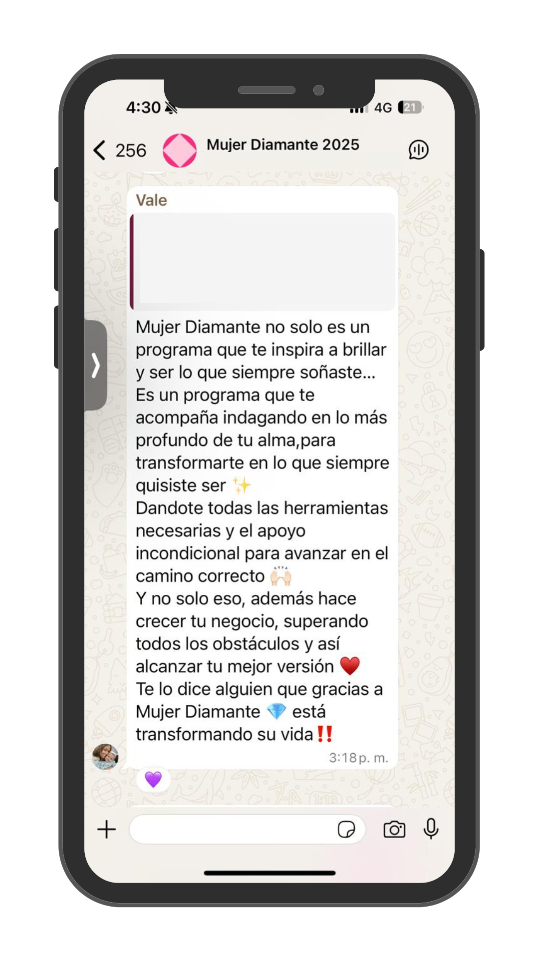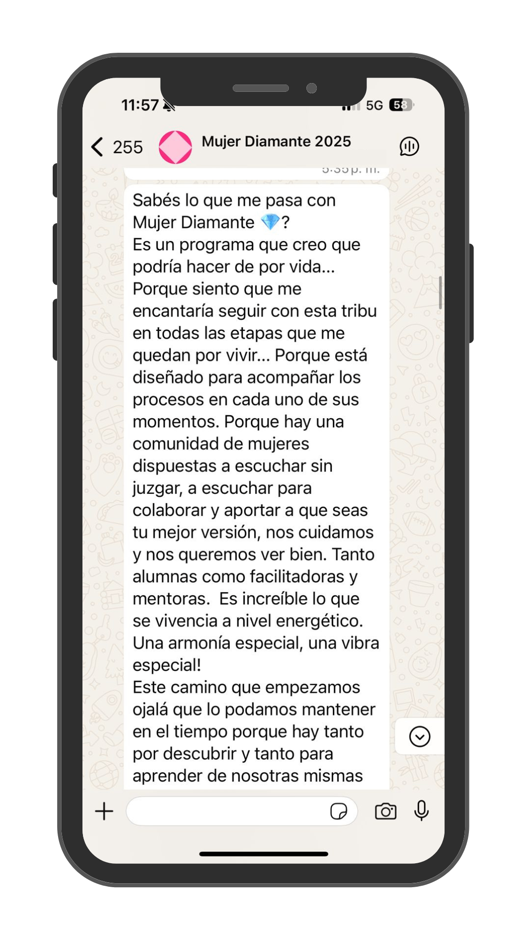Grupo de WhatsApp exclusivo, donde estarás siempre acompañada y conectada con otras mujeres que, como vos, están transformando sus vidas.